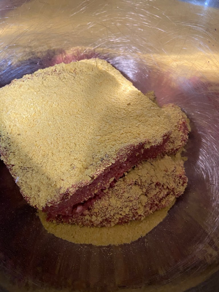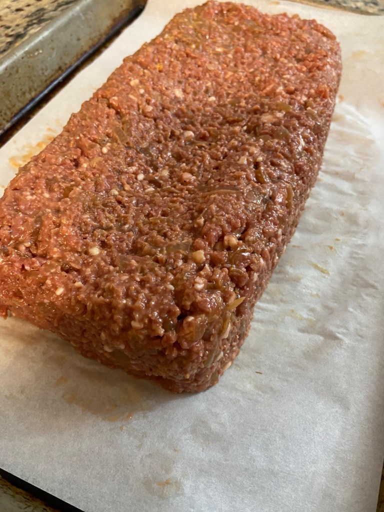 I then put two packs of Impossible Meat into a mixing bowl, add the salt and pepper, nutritional yeast, ketchup, and mustard, and then add the slightly cooled onion/garlic mix. I use my hands to mix these until well combined. I lay out some parchment paper on a quarter sheet pan, and mold the mix into a loaf directly on this. I do not like cooking a meatloaf in an actual loaf pan, this way I can brush the BBQ sauce on most of the loaf. Once in the loaf shape brush the BBQ sauce on the top and all sides. Place in a 350 degree oven for 30 minutes, I spin the pan around after 15 minutes.