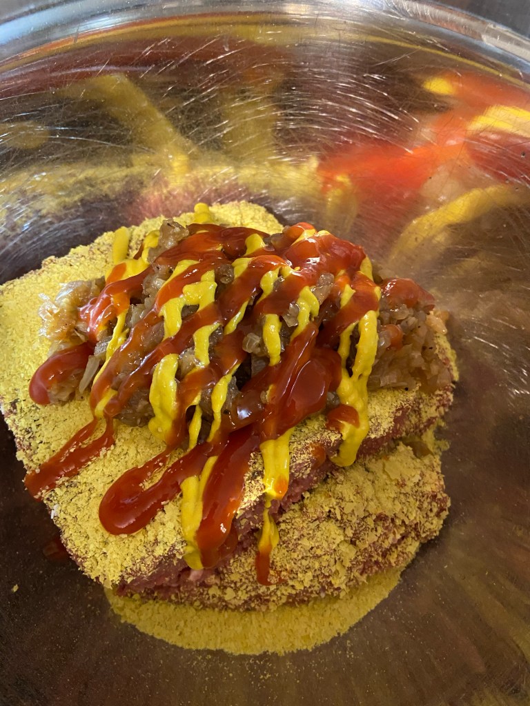 I posted the process of making this meatloaf, using Impossible Foods grounds, on my Instagram story last night and received so many requests for an actual recipe I figured I better get to it! This is sort of a hybrid recipe – I know some people use onion soup mix for their meatloaf. My grandmother, while she made meatloaf probably once a month, never used onion soup mix. She always used ketchup and mustard in hers, so I am used to that flavor profile and wanted to keep that aspect to reflect back to what my grandmother used to do. I don’t like the packets of onion soup mix so I went with the whole foods approach – onion and garlic slow cooked in some vegan butter.