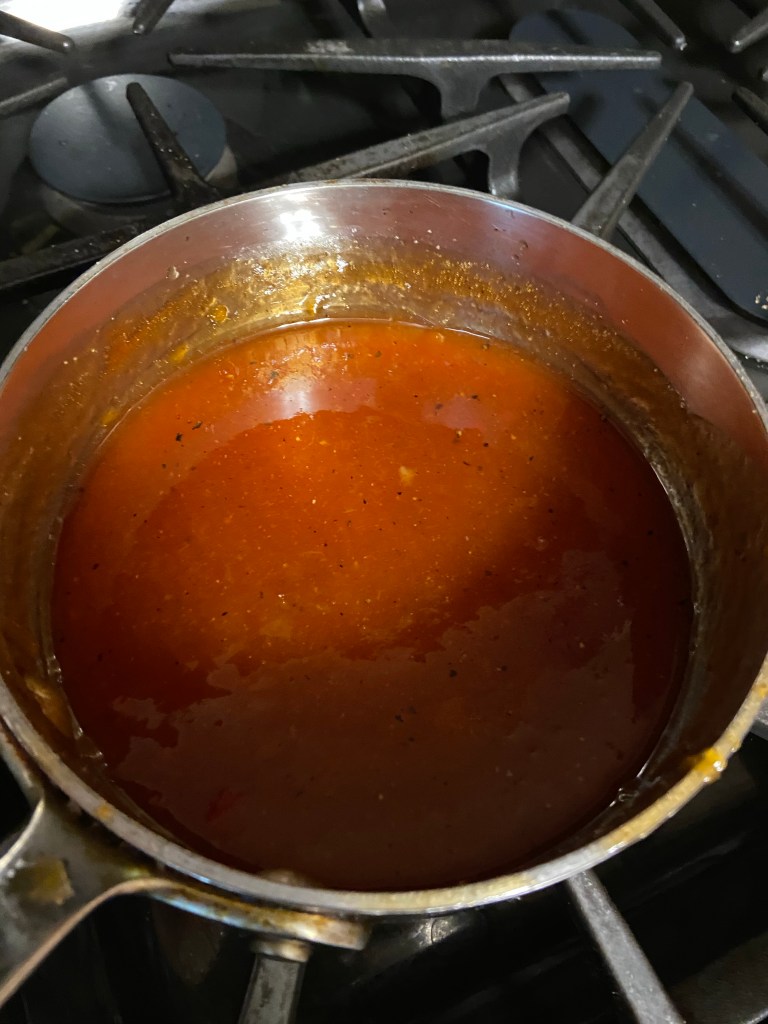 The BBQ sauce comes together quickly. Simply place the apricot preserves in a small sauce pan, add the ketchup, maple syrup, apple cider vinegar, garlic powder, onion powder, salt & pepper and simmer on low for about 15 minutes stirring occasionally. The sauce should thicken up slightly – taste and adjust seasoning as needed.